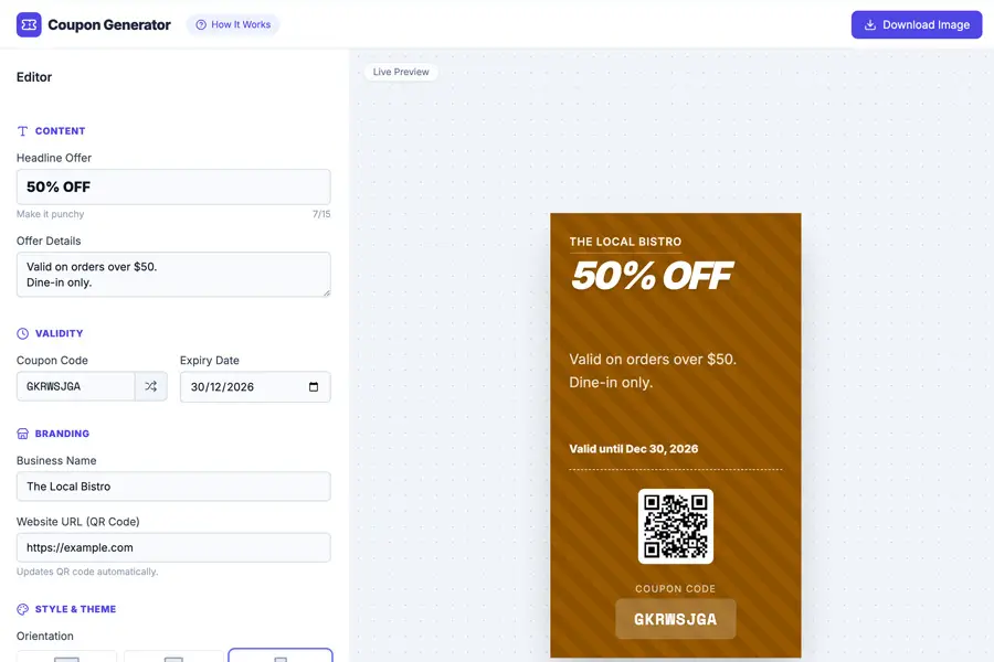 Generate clean, professional coupon images that look great on social media, websites, and print. Choose layouts, colors, and styles that fit your brand in seconds.