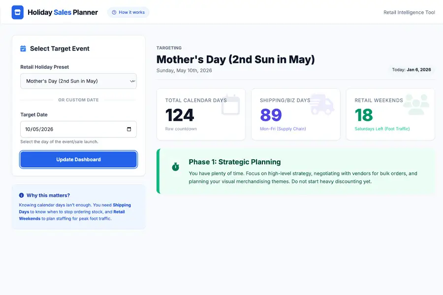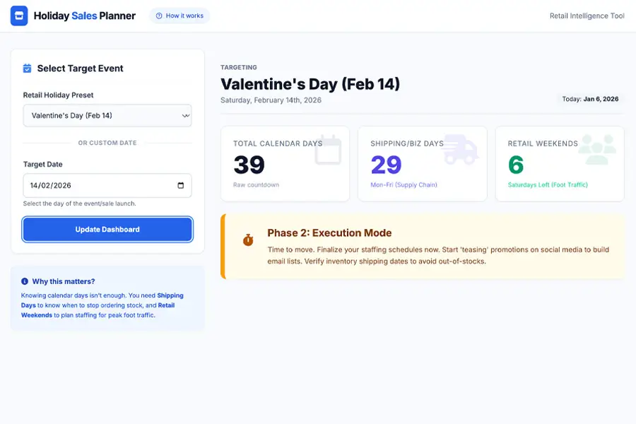 Track how many days remain before key holidays and events. Perfect for planning promotions and creating urgency at the right time.