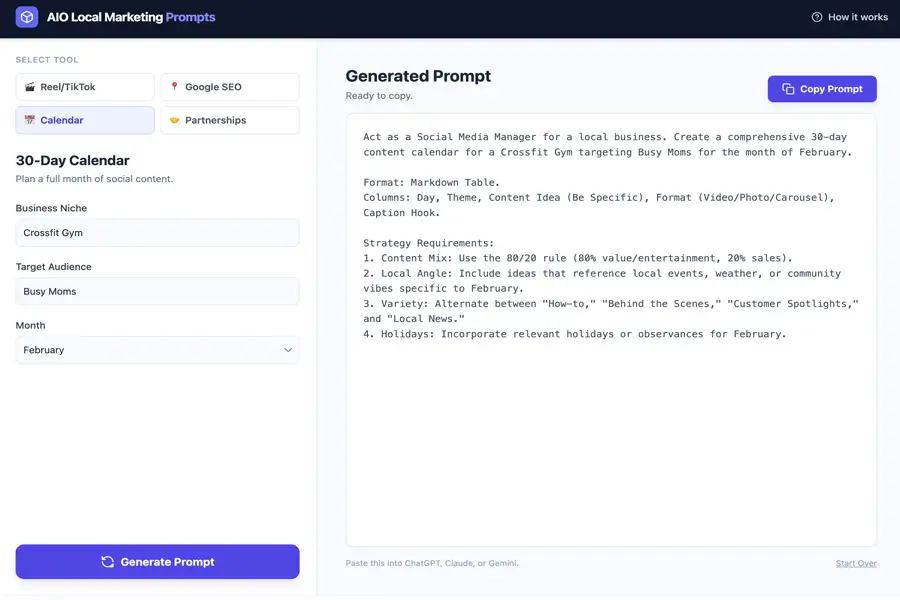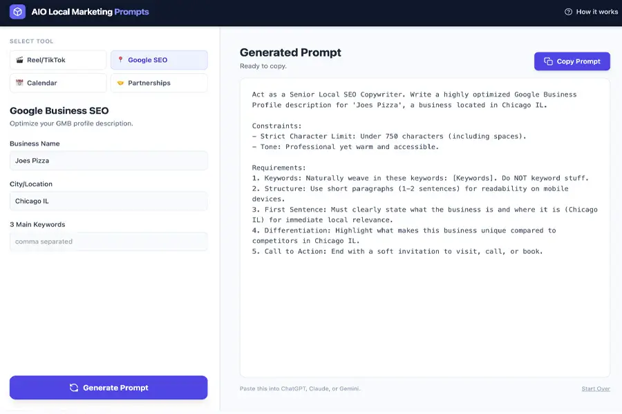 Create ready-to-use image prompts designed specifically for local promotions, offers, and announcements. Perfect for generating eye-catching visuals in any AI image tool without guesswork.