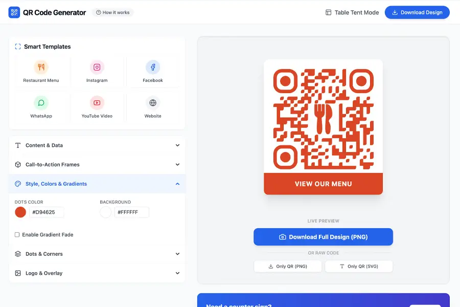 Create beautiful QR codes with themed designs for menus, promotions, reviews, or contact info. Download instantly and use them online or in print without technical setup.